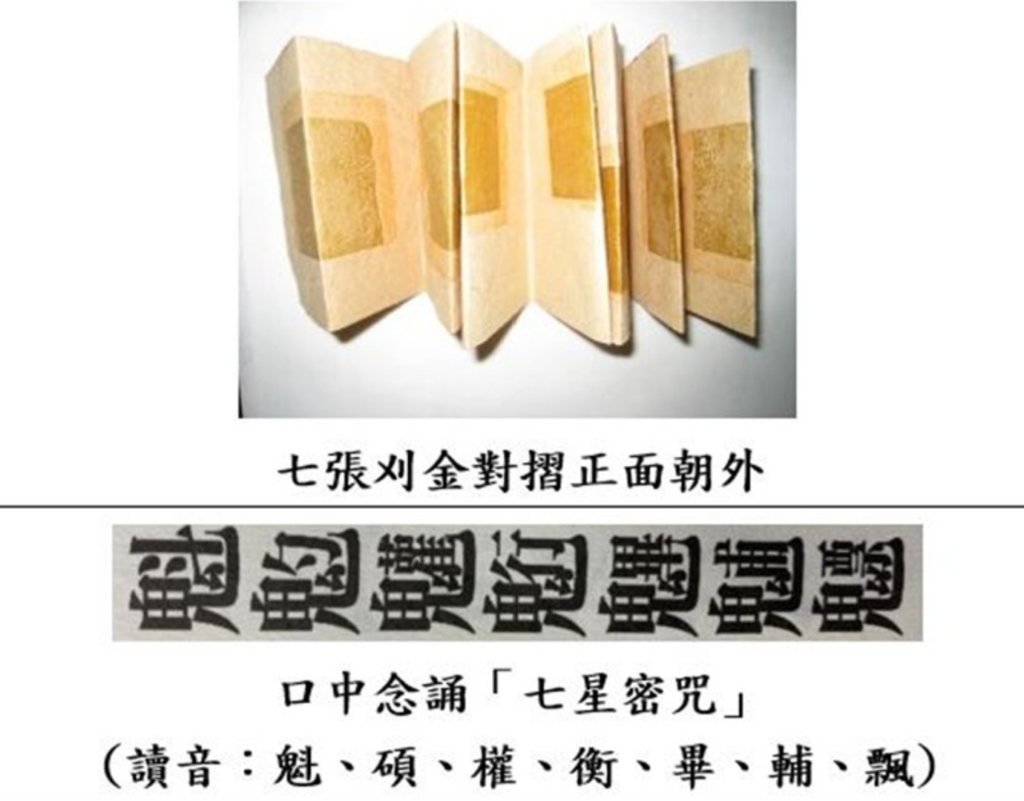 準備 7 張刈金對摺、金箔朝外,放在自家門口地上點火焚燒。人跨火進門,同時口念讀音:「魁、碩、權、衡、畢、輔、飄」。這七星字源自古籍淨煞口訣,有「火破晦、光驅陰」之意。燃燒產生熱氣流,能有效分散低頻能量殘留。「跨越火焰進門」這個動作,是一個明確的儀式訊號——告訴你的身心靈:「戶外頻率到這裡為止,不進家門。」