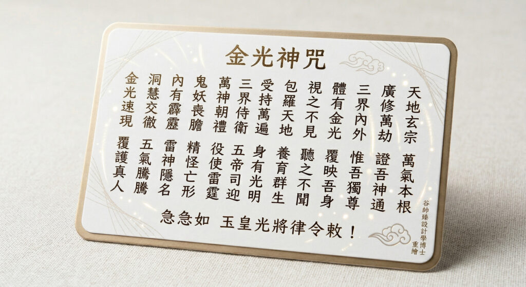 洗完澡後,找安靜角落靜坐,緩慢念誦「金光神咒」數次。誦唸時,觀想一道金光照耀頭頂包覆全身,直到身體感到發熱或出汗。本質上這是一套「正念呼吸+能量觀想」組合——重複誦唸可穩定神經系統觀想金光幫助身體從「緊繃模式」切換回「修復模式」。感到微熱或出汗,是能量場開始回穩、低頻殘留正在排出的訊號。