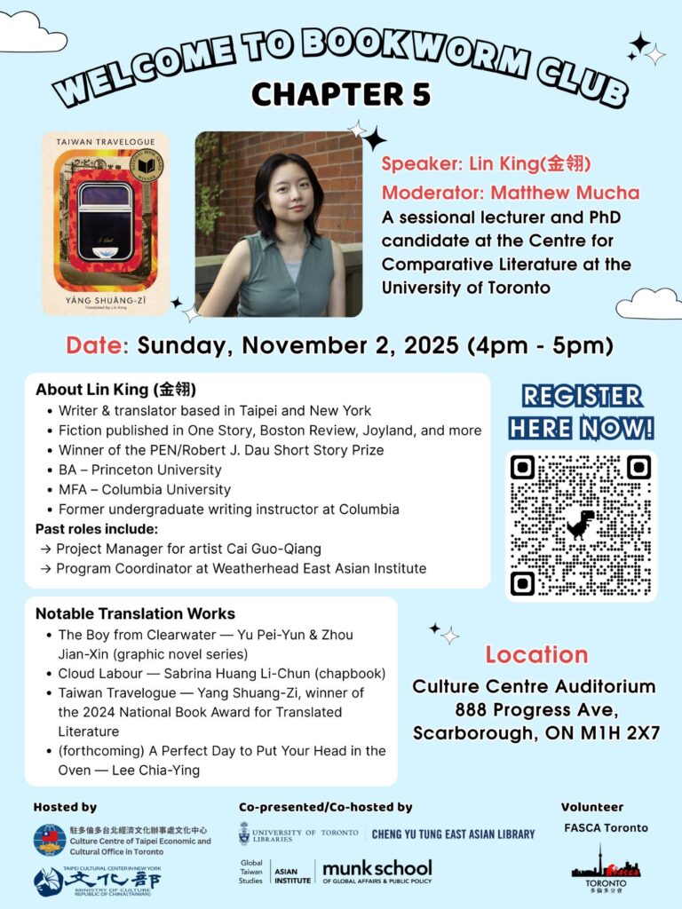金翎是作家楊双子小說《臺灣漫遊錄》英文譯者,該書2024年由美國Graywolf Press出版,榮獲美國國家圖書獎與亞洲協會夏白芳圖書獎翻譯文學獎,並讓金翎入圍美國文學翻譯家協會(ALTA)國家翻譯獎與最佳新銳譯者獎。繼今年在美國舉行巡迴講座後,這是金翎首度赴加拿大推廣,將於11月1日參與2場作家節座談,與譯者程異(Jeremy Tiang)、Ryad Assani-Razaki,以及韓裔作家Jinwoo Park對談文化認同、離散記憶與歷史書寫等議題,也將與多倫多大學鄭裕彤東亞圖書館合作,於多倫多僑教中心舉辦延伸講座,與該校比較文學中心講師Matthew Mucha對談。