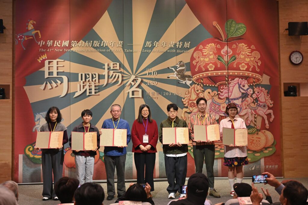 隨著時代演進,年畫的表現形式逐步從傳統象徵吉祥寓意的圖騰符號,拓展為兼具文化意涵與當代視覺語彙的藝術創作,並在當代藝術發展脈絡中,呈現出多樣化的版畫技法與創作形式。本屆首獎優秀創作共6件,分別是金昱慈的〈馬步春風〉,以金馬象徵吉祥勝利,將馬的神格以色彩和裝飾優美的方式呈現;游智涵〈馬奔丙午〉,描繪紅馬駕駛賽車衝向終點的場景,充滿了現代色彩與現代馬的神采;陳永欽〈馬躍揚名〉,呼應臺灣作為晶片生產王國之榮耀,駿馬躍起揚名世界,期望馬年好財運、事事如意;李岳霖〈黑馬贏新年〉,黑馬氣勢磅礡,一條「贏」字金項鍊,期許新的一年奮力向前、「贏」新年;楊振華〈駿馬迎春〉,兩匹駿馬佇立於林間水畔,與周圍繁茂的花草及吉祥富貴的孔雀,呈現春日生機盎然的氛圍;蔡庭歡〈馬踏蘋安轉運來〉,在巨型蘋果造型的旋轉木馬上,三匹駿馬分別乘載「馬上幸福」、「馬上發財」、「馬上平安」,將祝福具象化。