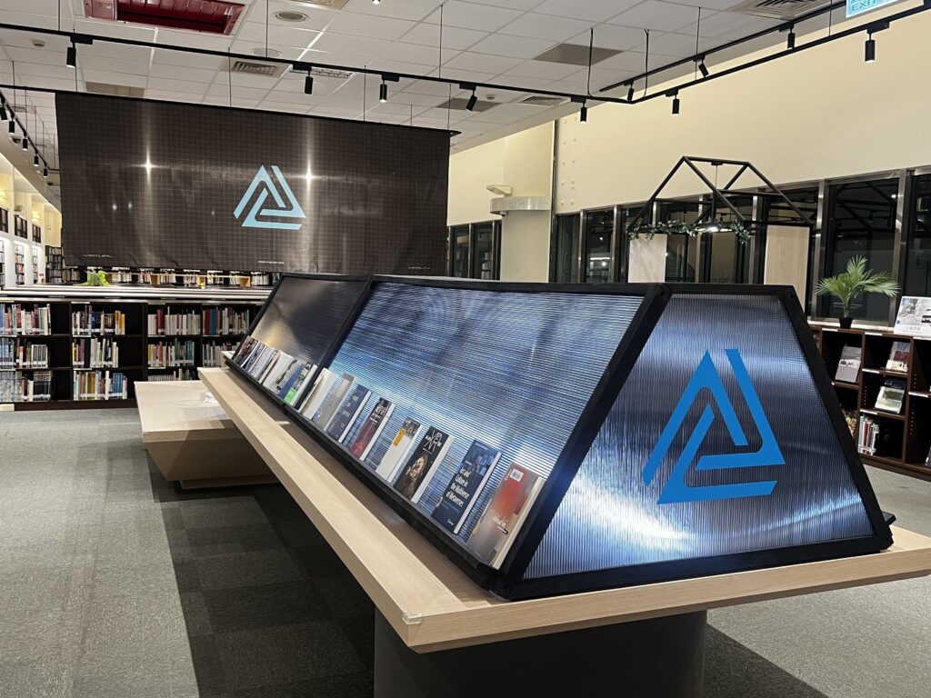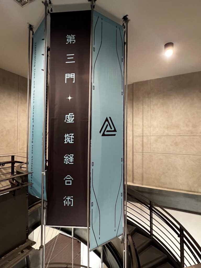 展覽現場透過多樣化的視覺輸出及觀展動線,引導觀眾從平面閱讀逐步走向沉浸體驗的轉譯實驗。展區共分為三大部分,首先是策展心智圖:位於策展區的大圖輸出,將複雜的轉譯邏輯轉化為視覺網絡,成為觀者進入展覽的導讀門檻 。其次是時空轉譯論述:展區分別以「空間的轉譯」與「時間的生成」為題 ,深入探討閱讀如何讓時間展開、讓空間折疊。最後是「沉浸式視覺引導:從入口處高達 4 公尺的旋轉樓梯掛旗 ,到玻璃展櫃的幾何透貼與閱讀區懸掛裝置 ,觀眾將穿梭在由數位網格與藝術論述交織而成的物理空間中。