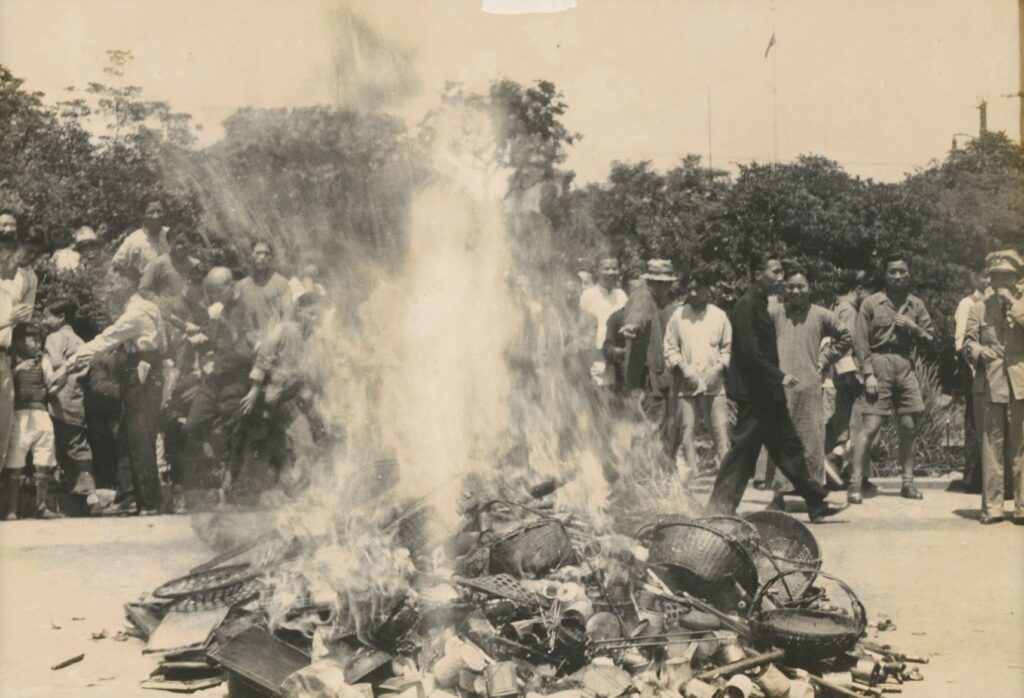 從「都城飯店」(Metropole Hotel)對面高樓俯拍的〈電車交叉道〉,鏡頭同時收進了象徵現代化的汽車、卡車與傳統的人力黃包車、牲畜拉車等各式交通工具;〈捏麵人〉近距離捕捉師傅的巧手藝與孩童的純真;而在〈六三節燒鴉片〉系列照片,張才又像個攝影記者,以連續畫面記錄「六三禁煙節」焚毀沒收的煙土、煙具的公開活動;〈街頭賣開水的老婦〉的背景是西方現代化高樓,和前景的人力車伕、路邊賣水的老婦人形成強烈對比。