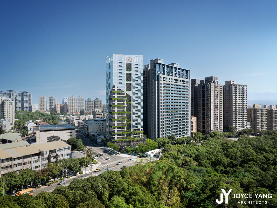 她記得磐鈺建設董事曾說過一句讓她深受啟發的話:「台灣大道上有很多漂亮又優秀的建築物,我們位在台灣大道和玉門路的街角,怎麼讓我們的大樓能受到注視?」這句話成為設計概念的起點。「我開始思考,這棟住宅如何跳脫制式?既然基地旁是一片綠海,有沒有可能讓綠不只是『在建築旁』,而是『走進建築裡』?」於是,《磐鈺雲詠》的量體語彙、立面韻律與景觀結合方式逐漸成形,成為一座讓自然穿越建築、讓城市呼吸的生活場域。