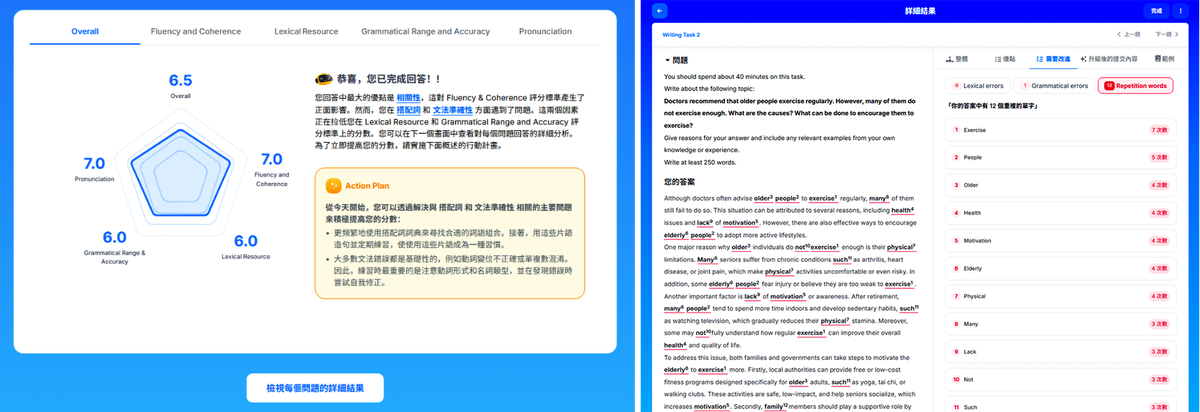Prep Edu 的 AI 虛擬考場(AI Virtual Test Room)更成為亞洲最受信賴的模擬考工具之一。系統運用大量真實作答資料及嚴格審核的評分模型,針對口說與寫作給出細緻評分。每項評分回饋皆貼近真實考試的評量維度,協助學員精準找出文法、發音及答題弱點。