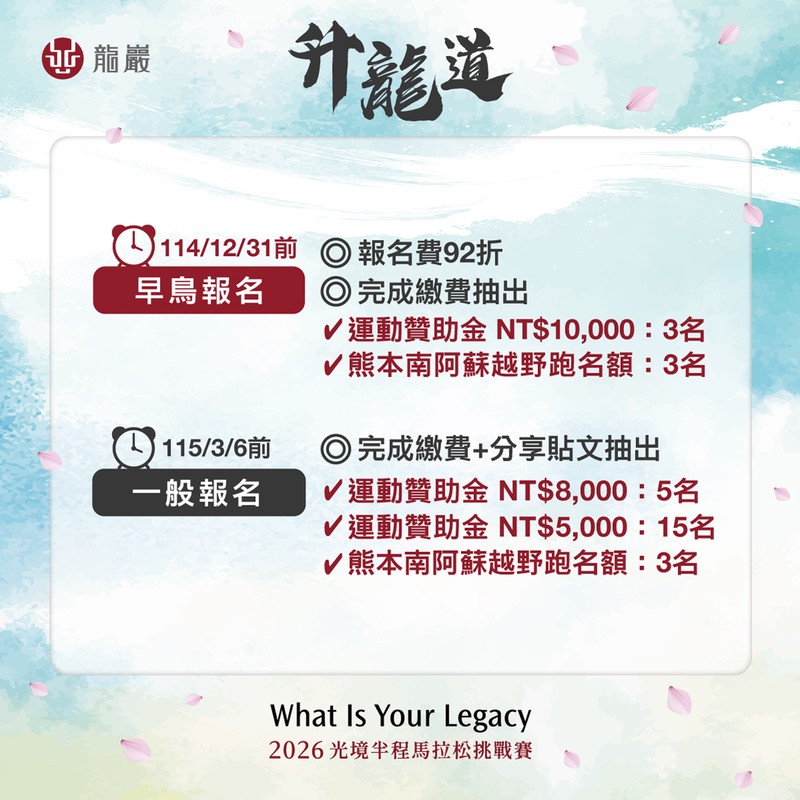 本屆賽事即日起開放早鳥報名至2025/12/31,可享92折報名費優惠,再抽多名NT$10,000運動贊助金,2026/1/1至3/6期間完成報名與貼文分享,即可抽多名NT$8,000及NT$5,000運動贊助金。另外,只要報名本屆賽事,皆有機會再抽中「2026熊本南阿蘇越野跑」免費路跑名額(詳細活動辦法請參考報名網頁 https://bao-ming.com/lungyenmarathon2026)。