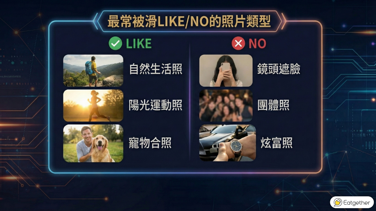 在交友軟體上,照片就是你的視覺履歷。Eatgether 年報數據分析了最常被滑「LIKE」與「NO」的照片類型,發現 2025 年的用戶更傾向尋找「真實且溫暖」的連結。