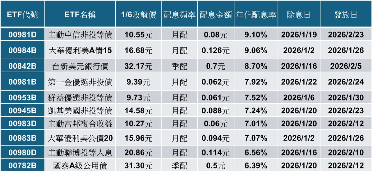 觀察1月除息的債券ETF前十大榜單,高息競爭戰進入白熱化階段,00981D預計每單位配發0.08元,若以1月6日收盤價10.55元計算,年化配息率高達9.10%,再次傲視市面上所有債券ETF。本月預計1月19日除息,投資人須於1月16日前持有或買進,2月23日即可領到配息。
