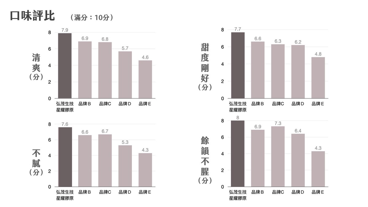 結果顯示,【弘茂生技】逆時光星耀膠原蛋白胜肽在整體風味與口感接受度上獲得較高平均評分,於多項試吃指標中表現相對突出。