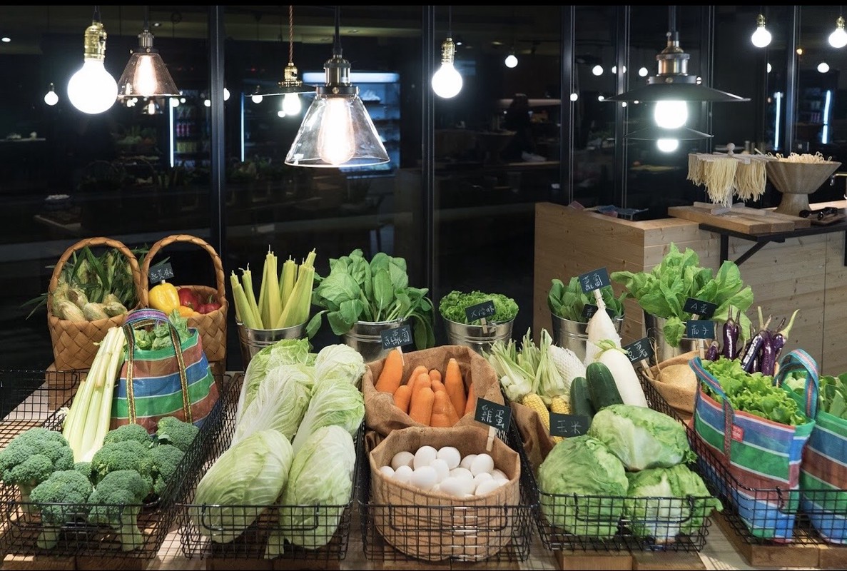 嚴選產地直送市集區食材共約60多款,約40款精緻蔬菜不限夾取次數,由賓客選擇喜愛的蔬菜,服務人員現洗、現切,新鮮安心看的見。冬季可品嚐到高人氣茼蒿、水果玉米、栗子南瓜、新鮮帶穗玉米筍、剝殼栗子等時蔬,賓客可依個人喜好自由搭配,不僅蔬食愛好者可大啖頂級蔬食,也讓火鍋餐桌呈現豐富而純淨的蔬食美學。