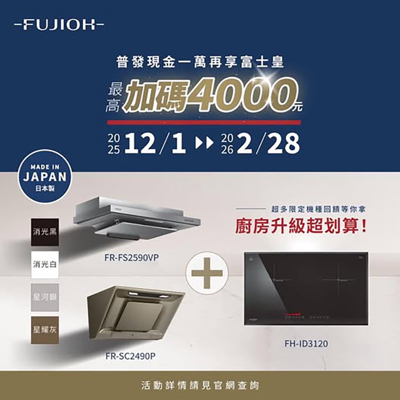 現在,搭上近期普發一萬元話題,台灣富士皇推出「普發一萬元再放大」的加碼回饋,活動自2025年12月1日起至2026年2月28日,鎖定年前居家汰舊換新需求,凡購買FUJIOH日本製抽油煙機搭配日本監製IH雙口感應爐,最高可獲4,000元全聯禮券回饋。消費者只需於全台120家的合作通路購買,再到活動官網完成登錄即可,登記申請則至3月31日截止。張育綿表示,藉由普發放大回饋活動,幫助民眾過年前升級廚房設備,兼顧健康與品質之餘,還能追求更簡單舒適及幸福的家居生活。活動詳情可至台灣富士皇官方網站查詢。