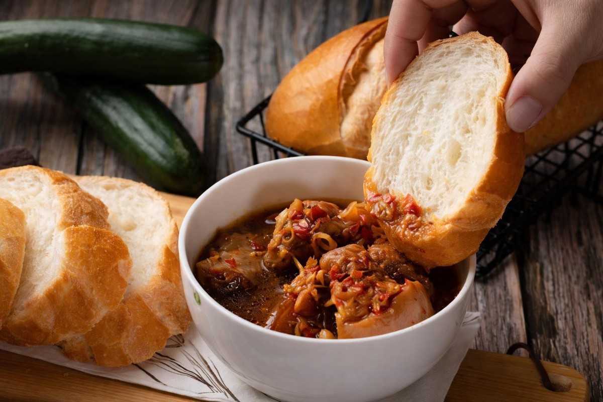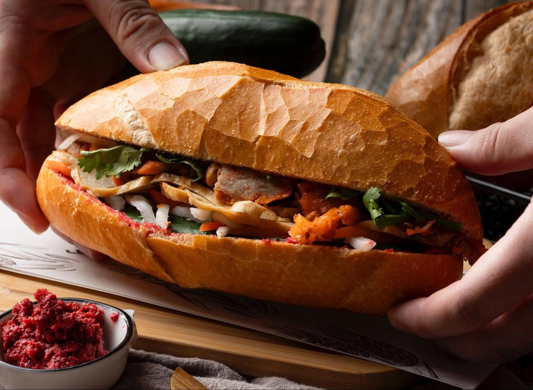 越式法國麵包(Bánh mì)是融合法式麵包外皮與越南式醬料、肉類、醃菜等餡料的經典街頭小吃。相較台灣吐司或軟麵包,其外皮更酥脆、餡料鹹甜交錯,風味明顯不同,具代表性異國風格。