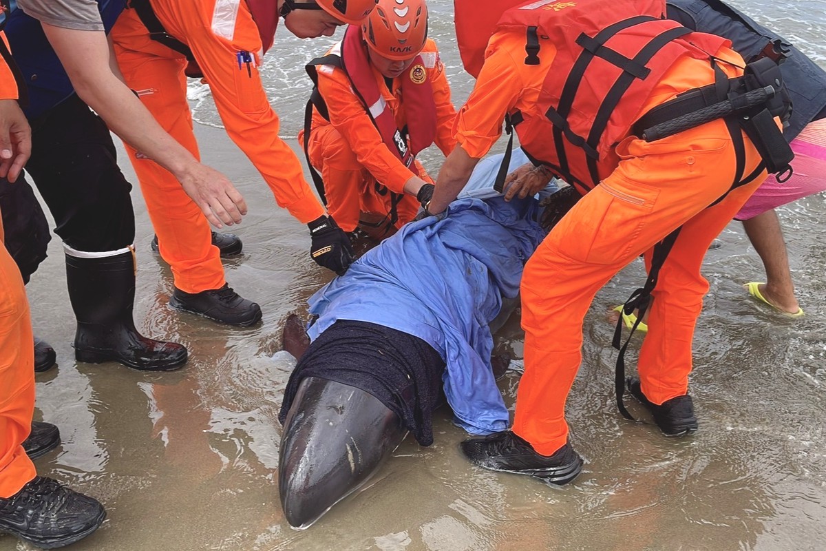 屏東車城海口沙灘小虎鯨集體擱淺 海巡搶救海放