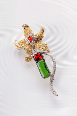 創作理念:麗園春花飄香味,鴛鴦同游共雙飛,悄悄問花蕊,雙人可否長依偎,一生能否緊跟隨。花盛開的季節放眼望去的所有一切,會讓人心靈重生般的目眩神迷,覺得更積極起來,沉睡在內心一角的珍貴回憶也甦醒,讓有情人終相依偎。(花型-紅綠碧璽)