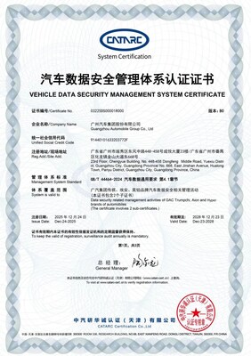 天津和廣州2025年12月31日 /美通社/ — 12月24日,廣汽集團在汽車數據安全領域再獲權威認可,成功獲得行業首張汽車數據安全管理體系認證證書(證書編號:03225DS00001),標志著廣汽集團在數據安全體系化建設方面走在了行業前列,為智能網聯時代的汽車數據治理樹立了全新標桿。