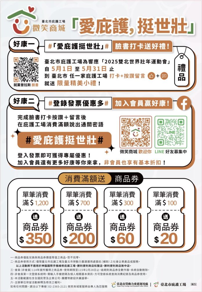 臺北市庇護工場為響應即將到來的2025雙北世界壯年運動會,自5月1日起至5月31日止,推出「愛庇護,挺世壯」雙重送好康活動,邀請選手及民眾一同支持庇護工場,共同迎接這場國際盛事!