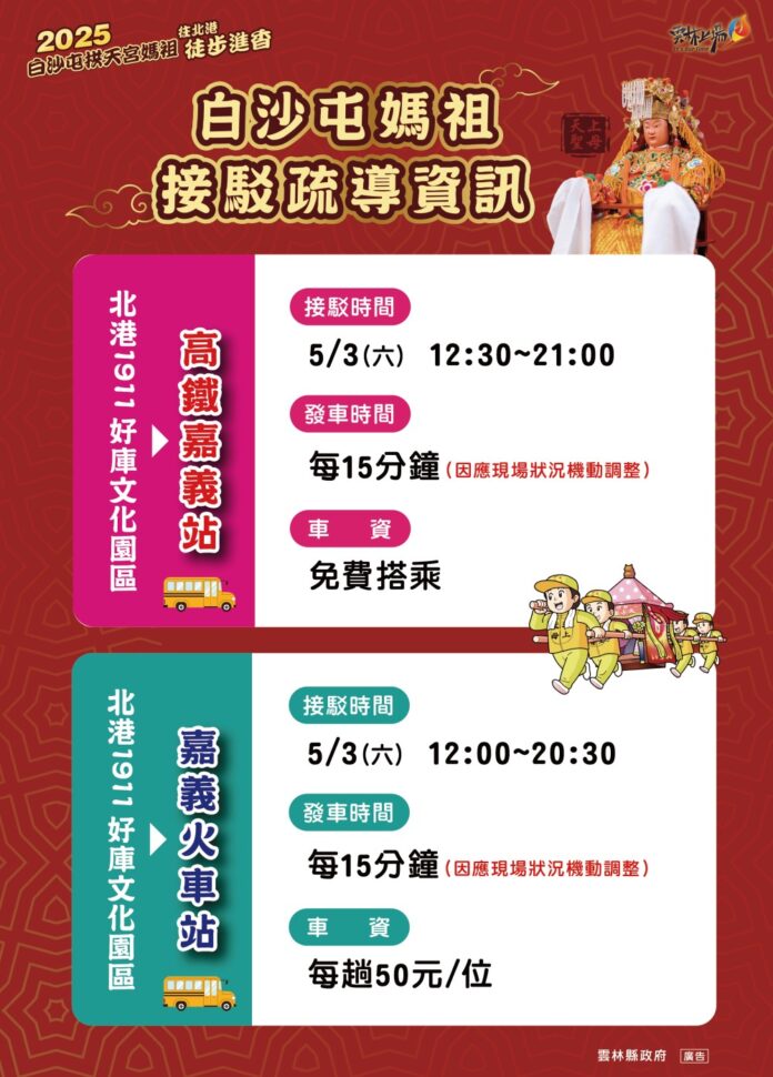 為解決進香期間的交通問題,雲林縣政府積極與北港鎮公所協調,特別安排規劃提供「北港1911好庫文化園區-嘉義高鐵站」之免費接駁車服務。接駁時間預計於5月3日(星期六)中午12:30至晚上21:00,每15分鐘發車一次,讓信徒能夠輕鬆往返於北港與嘉義高鐵站,滿足進香民眾的需求。