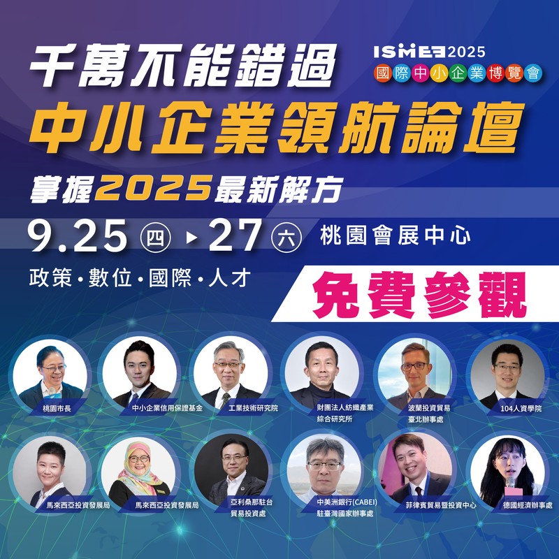 「2025國際中小企業博覽會」(ISMEE 2025),將於 9月25日至27日在桃園會展中心盛大登場。匯聚國內外逾百家產業菁英,聚焦「AI應用」與「永續轉型」,共同打造中小企業創新轉型與國際合作的重要平台。