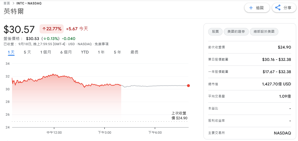 市場專家認為,輝達入股重置了英特爾在AI基礎建設中的地位,有望從落後者進化成未來不可或缺的一環;至於對手超微(AMD)與博通股價短線承壓,分別下跌1.3%與0.5%。