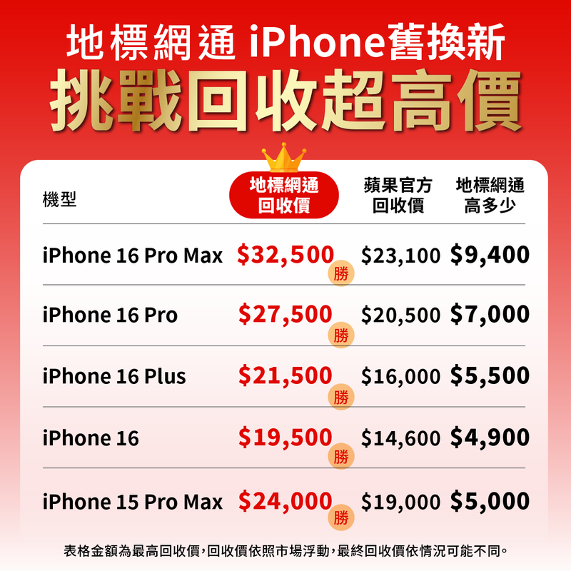除了開賣即降價,地標網通也同步推出 iPhone 舊換新方案,9月底前持iPhone 14(含)以上機型回收加碼500元,最高可折抵新機售價達 32,500 元。以 iPhone 16 Pro Max 1TB 為例,回收估價比蘋果官方 Apple Trade In 還高出 9,400 元,就連 iPhone 14 Pro Max 也能創造最高 3,400 元 的價差,對許多消費者而言相當具有吸引力。