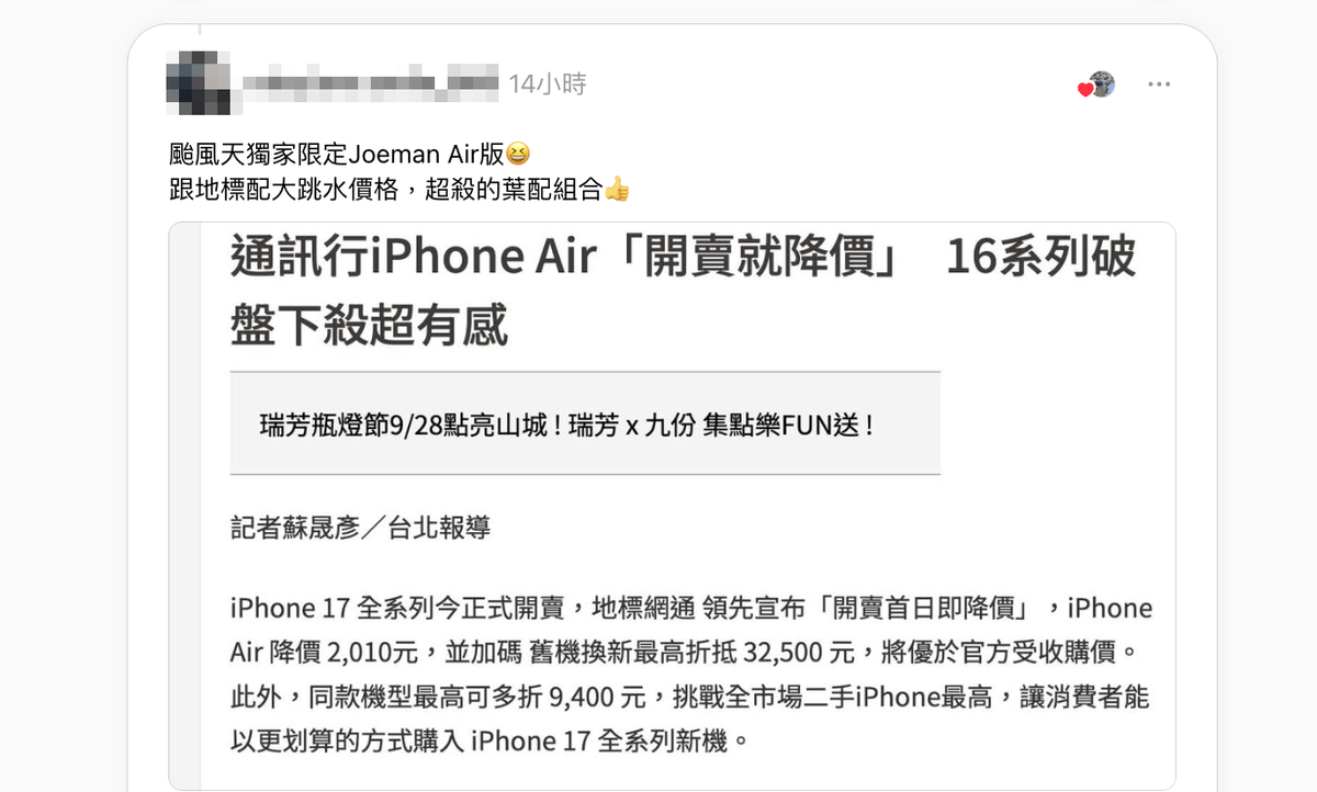 也有眼尖的網友指出「Joeman Air」原來是搭配地標網通的「iPhone Air 降價大跳水」,果然是超殺的業配組合。