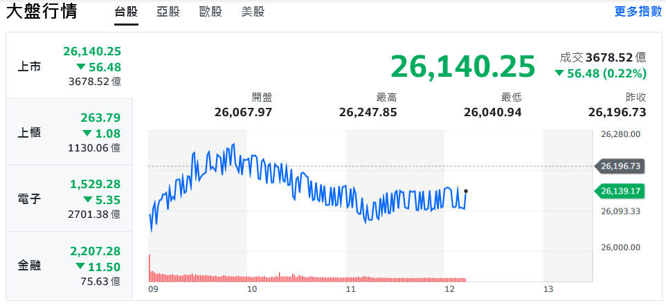 美股四大指數全盤皆墨,台股週四(25日)群龍無首、持續高檔震盪,台積電暫時熄火,加權指數開盤一度挫低逾百點,面臨26000點保衛戰,盤中隨鴻海、聯發科挺身而出,指數呈現反彈,資金匯聚面板、PCB、電纜族群,預估成交量約5300億元。