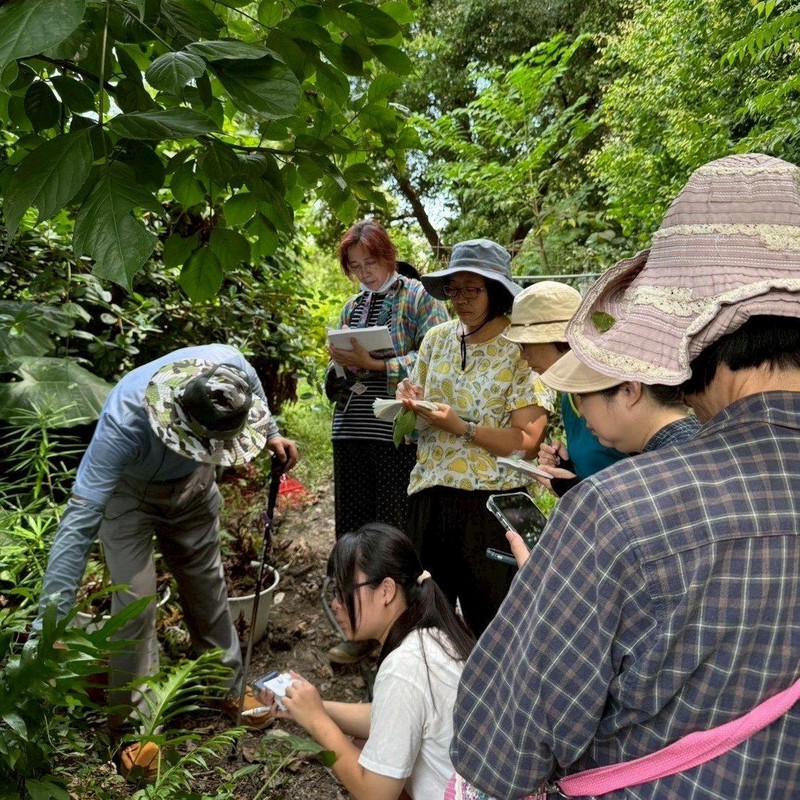 青草達人翁義成老師帶領學員透過戶外走讀認識青草。圖/中華民國普輝綠色共好發展協會提供