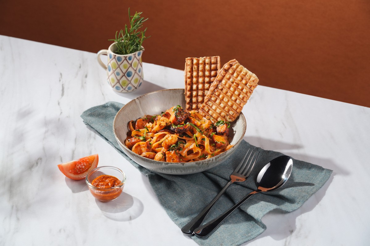 TOASTERiA CAFE 林口MITSUI OUTLET PARK不只延續品牌經典的帕尼尼、義大利麵與地中海早晨系列餐點,並將重新推出林口三井開幕限定菜色:香料厚切牛舌、火烤章魚白花椰義大利麵、炸魚柳薯條與香煎茄泥冷盤。
