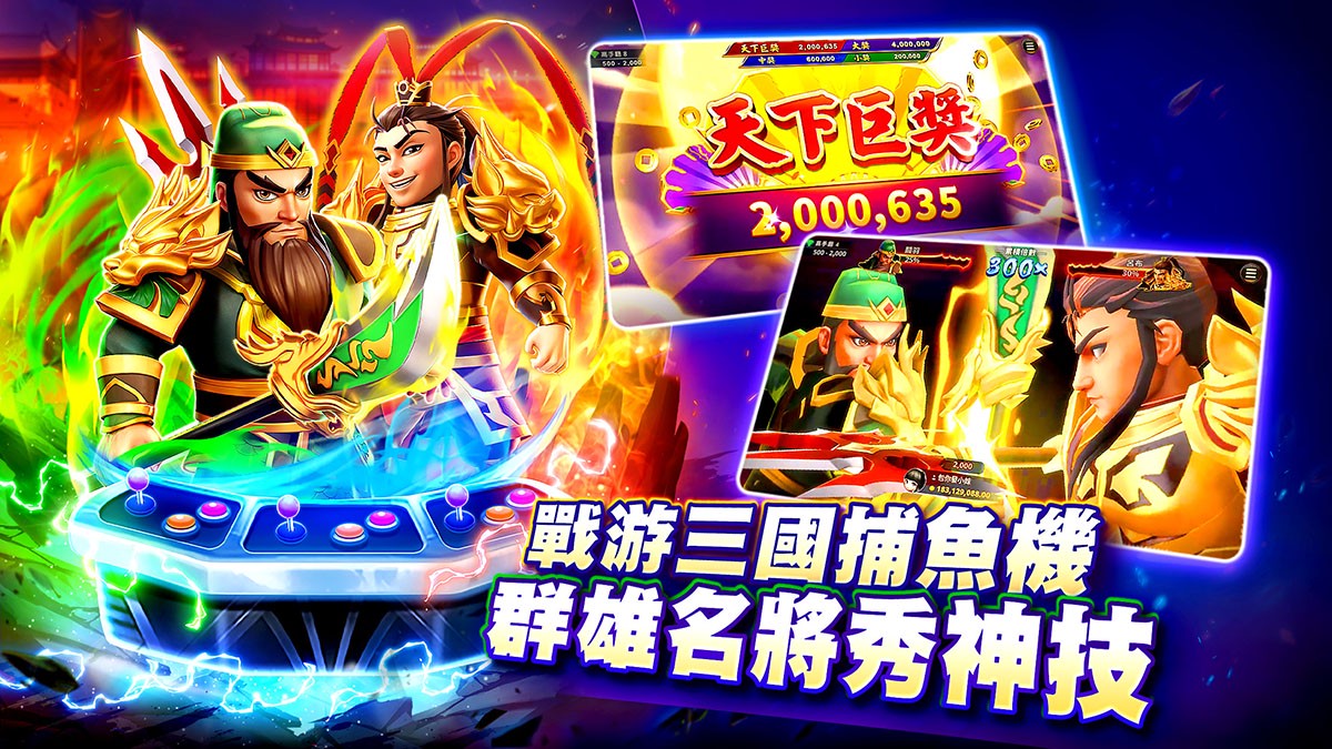 劉備、關羽、張飛、孔明、孫權、周瑜、曹操、許褚、呂布、貂蟬、張角等眾多知名三國角色將一一登場,搭配手機隨玩設計,讓玩家隨時隨地征戰沙場,打造前所未有的三國沉浸式捕魚機玩法體驗!
