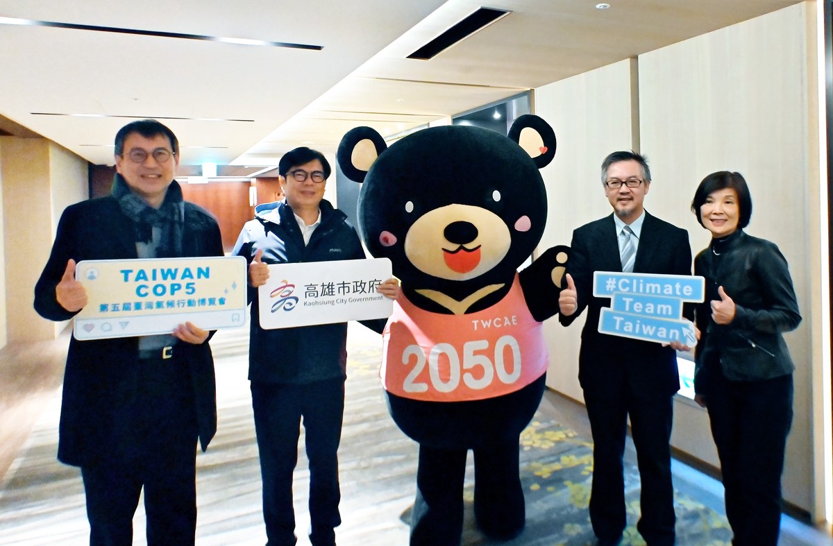 行政院能源及減碳辦公室執行長林子倫、高雄市長陳其邁、國際氣候發展智庫執行長趙恭岳及高雄環保局長張瑞琿(由左至右)與臺灣氣候行動博覽會吉祥物靜玲小熊合照。圖/主辦單位提供