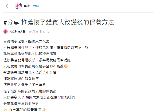 懷孕與產後期間,許多女性的身體與肌膚狀況都會出現明顯變化。一位網友近日在Dcard美妝版分享親身經驗,引起不少準媽媽與新手媽咪的共鳴。她提到,自己在懷孕後膚況變得比以往敏感,臉部偶爾出現泛紅與乾癢,過去習慣使用的保養品都變得不適合自己。