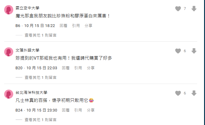 這篇文章吸引許多網友留言分享經驗,互相交流不同的保養方式與產品使用感受。有留言提到自己聽過該產品,評價很不錯;也有人回應自己有使用VT的保養品,會在代購時多買幾瓶;也有媽媽提到凡士林等基礎用品在孕期很好運用。整體留言多以交換經驗、提供參考為主,氛圍相當熱烈。