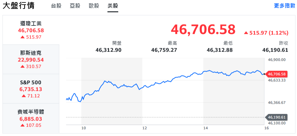 市場對美國企業財報與區域銀行體質擔憂明顯降溫,美股週一(20日)全面強漲,其中金融與科技股成為主要推力,道瓊終場狂飆515.97點、收46,706.58點;標普500漲幅1.07%、收6,735.13點;那斯達克勁揚310.57點、收22,990.54點;費半走升1.58%、收6,885.03點;小型股指數羅素2000(Russell 2000)大漲2%、走勢犀利。