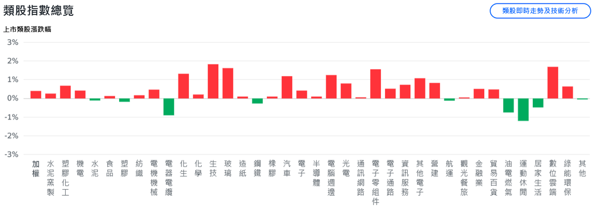 台積電早盤上漲20元,股價創下歷史新高,市值攀升至新台幣38.89兆元,貢獻大盤約160點;鴻海漲逾1%,突破240元,再創近18年新高;電子權值股同步勁揚,光寶科、和碩、緯創、大立光上漲1%至2%,聯發科、台達電持穩紅盤;日月光投控、聯電、廣達逆勢在盤下震盪。