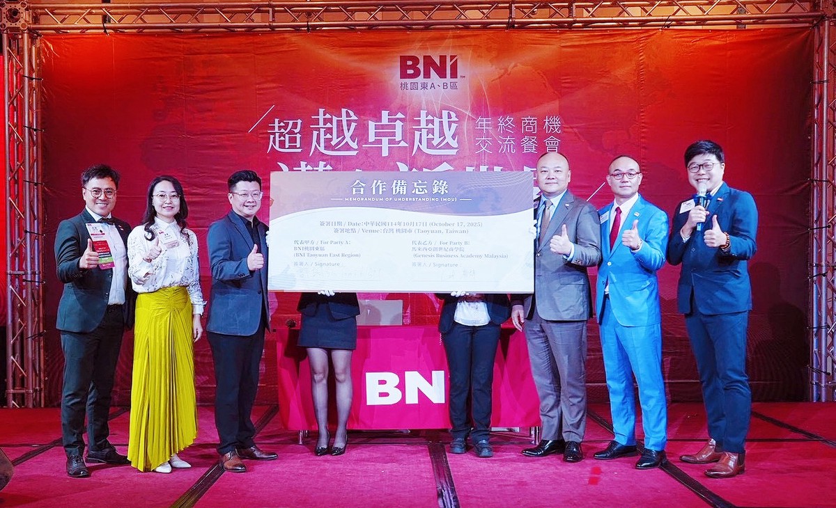 在全場見證下,BNI桃園東A・B區正式與馬來西亞創世紀商學院創辦人顏建博博士簽署國際合作備忘錄(MOU),共同開啟跨國企業教育與商務合作的新篇章。同時,創世紀商學院台灣分校校長程萬里與營運長陳馨淼、校董黃朝傑、校董張娜、校董楊文顯也共同出席並見證簽約時刻,象徵雙方合作邁入實質推動階段,開創台灣企業教育的新格局。