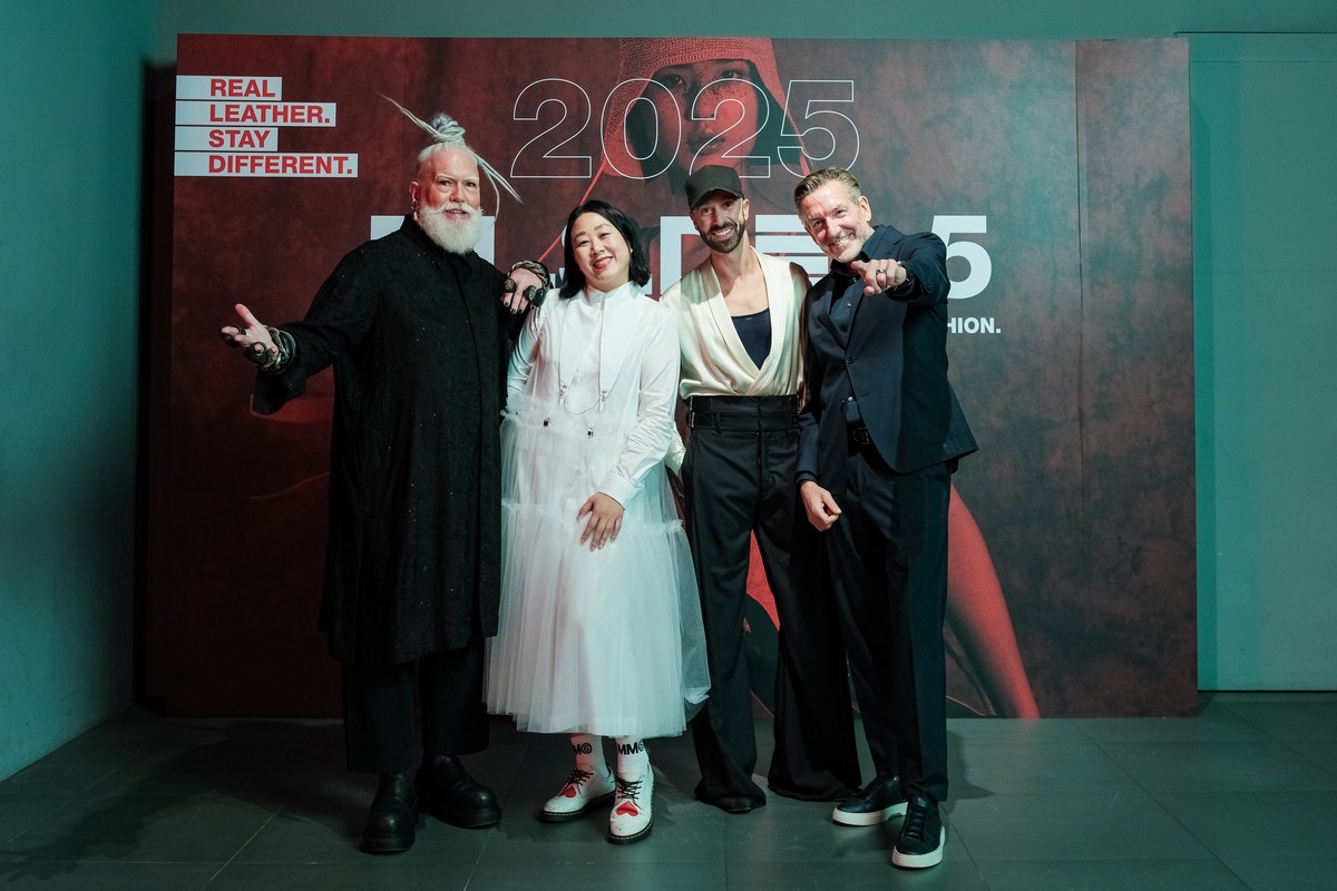 2025世界皮革創意設計大賽國際評審,由左至右為時尚教育顧問 Adrien Roberts、台灣《Harper’s Bazaar》總編輯 Kora Hsieh(謝可珍)、名人造型師 Mike Adler、評審團主席 HUGO BOSS Ticino總經理 Christopher Koerber。圖/2025 世界皮革創意設計大賽提供