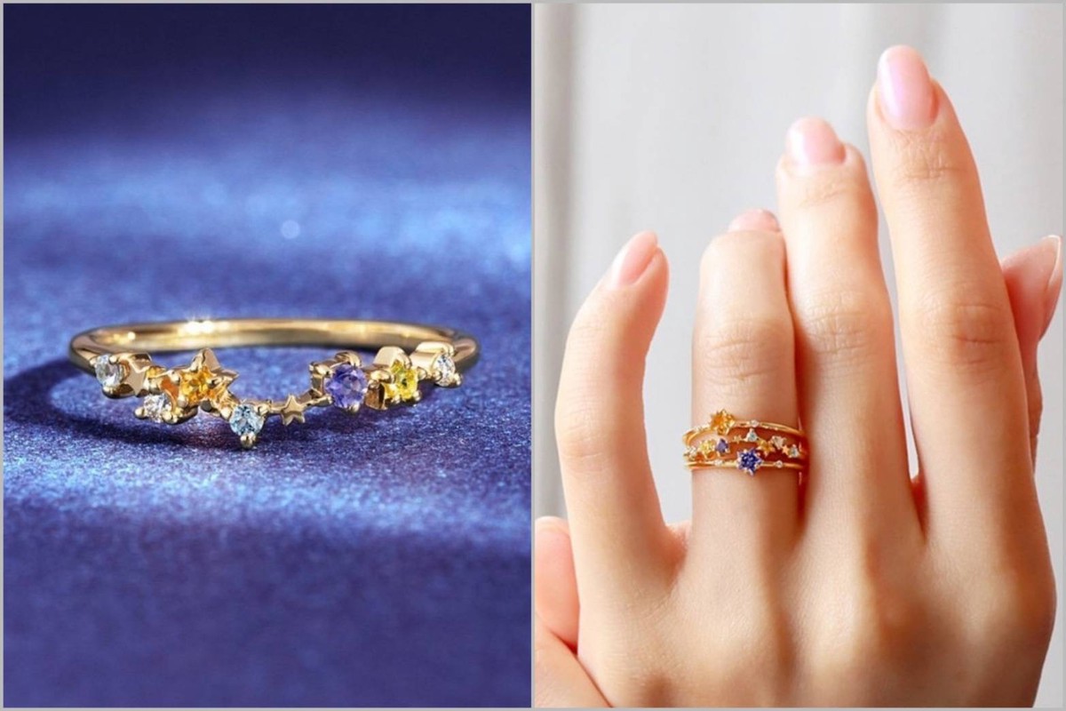 戒指佳作鑲嵌七顆寶石:黃水晶、海藍寶石與鑽石交織出層層光澤,如夜空中綿延的銀河閃耀流轉。無論單獨配戴或層疊搭配,都能綻放出專屬於你的星光風格。