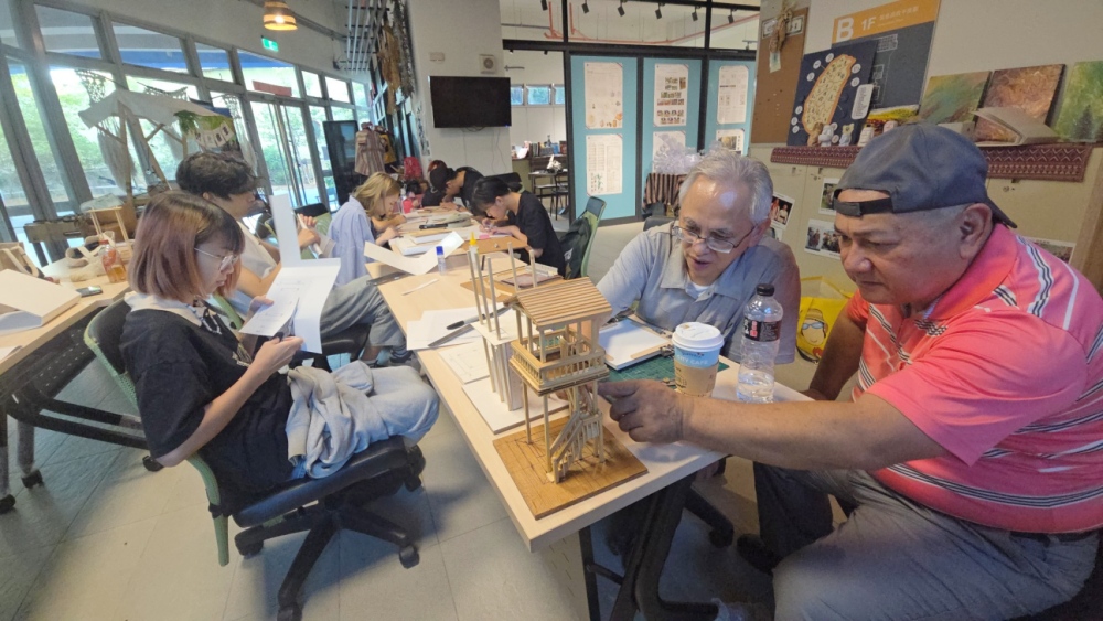 隨後課程走入真實場域,學生於中原大學信實基地周邊展開實地環境整備、場域丈量與基礎建造工作,在泥濘土地與天候變化下進行立柱、撐樁、校正水平與垂直角度、搬運材料、現地調整與施工組裝等任務。即便遇到雨天施工不便,學生仍穿著雨衣持續投入,透過拉繩、扶柱、固定支架等團隊協作,展現高度投入與責任態度。透過此階段的真實施工經驗,學生體會到紙上設計與現場落地之間的差異,學習隨機應變、溝通協調、現場判斷、材料掌控與問題解決能力。課程亦安排木雕與傳統工法學習,學生在工藝師指導下透過雕刻與手作,理解紋飾背後的族群記憶、文化敘事與精神象徵,使文化學習不再停留於理論,而是透過身體勞動與藝術參與建立深層情感連結。透過模型→施工→工藝的學習歷程,學生不僅提升技術能力,也逐漸理解文化內涵如何透過空間與構築被具象化呈現。