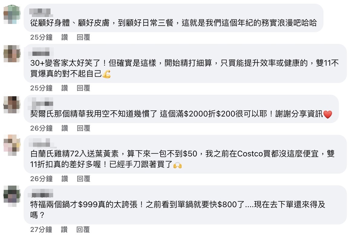 貼文引來不少網友留言共鳴:「特福兩個鍋才$999真的太誇張!之前看到單鍋就要快$800了….現在去下單還來得及嗎?」、「白蘭氏雞精72入送葉黃素,算下來一包不到$50,我之前在Costco買都沒這麼便宜,雙11折扣真的差好多喔!已經手刀跟著買了」、「契爾氏那個精華我用空不知道幾慣了 這個滿$2000折$200很可以耶!謝謝分享資訊」、「30+變客家太好笑了!但確實是這樣,開始精打細算,只買能提升效率或健康的,雙11不買爆真的對不起自己」、「從顧好身體、顧好皮膚,到顧好日常三餐,這就是我們這個年紀的務實浪漫吧哈哈」。