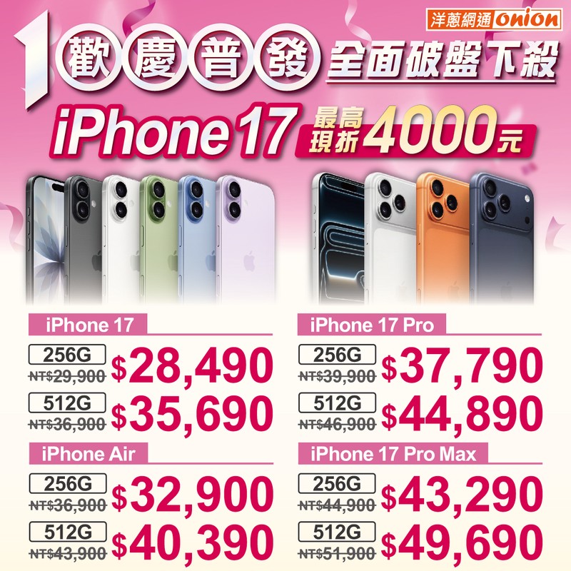 政府普發1萬元陸續入帳,剛好成為換新機的最佳補助。連鎖通訊–洋蔥網通表示,為了讓普發金「用的更有感」,特別針對 iPhone 17、iPhone Air、以及 17 Pro、17 Pro Max 全系列推出限時降價,最高再現折 4,000 元。以 iPhone 17 256GB 為例,洋蔥網通活動優惠價28,490元,搭配普發金再抵1萬,等於花費18490元就能升級最新iPhone 17,現在可說是最划算的換機時刻。