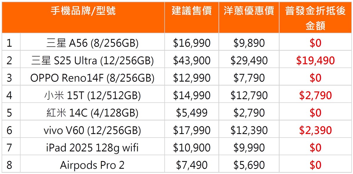 資料來源:洋蔥網通11/14門市報價。(優惠不定時變更,實際價格以門市為準)
