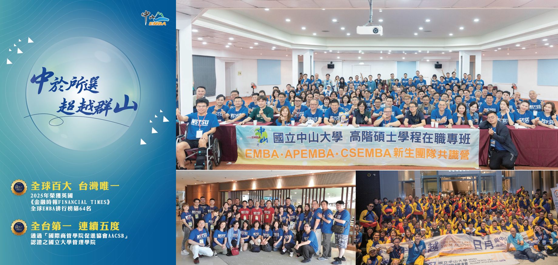 中山管院同時再度通過國際商管學院促進協會(AACSB)認證,連續五度獲得國際肯定,為全台第一所達成此成就的國立大學。AACSB為全球商管教育最具權威的國際認證體系,能連續通過認證的學院,代表其在師資、研究、課程設計與產學連結等面向,均達到全球前5%頂尖水準。秉持「中於所選,超越群山」的精神,中山大學EMBA以「立足台灣、深耕亞太、放眼全球」為願景,結合亞太營運管理組(APEMBA)與中山同濟境外專班(CSEMBA),形成跨越兩岸三地的高階經理人網絡,為企業領袖打造兼具國際視野與在地洞察的學習平台。課程設計融合核心管理理論與實務案例,並導入電子商務、AI人工智慧、ESG永續、低軌衛星、物聯網、元宇宙與數位轉型等新興議題,協助學員在變動的時代中保持競爭力與決策敏銳度。