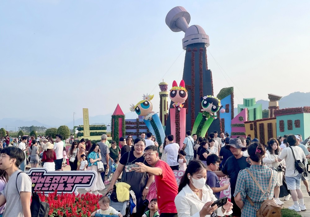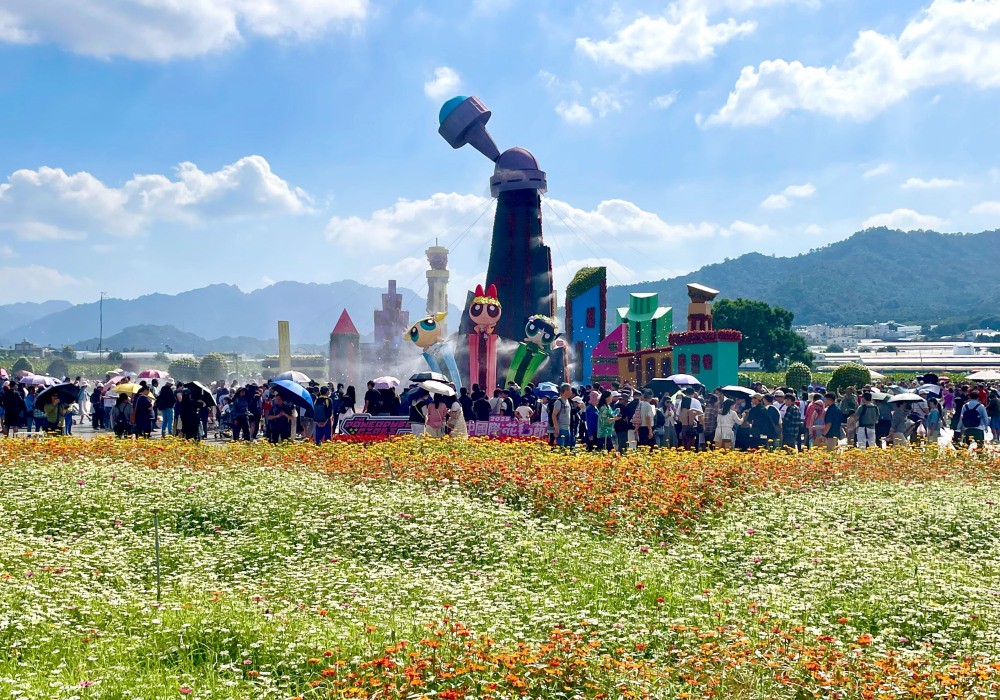 觀旅局指出,今年花毯節主題結合知名卡通飛天小女警,以史上最大規模的主花毯(高18米、直徑60米)為核心,每日上演泡泡與水霧特效搭配機械動態自動展演,持續吸引大批遊客駐足拍照。花毯內更設置盪鞦韆、甜甜圈店等場景,讓大小朋友都能參與其中。除了主花毯外,現場裝置也驚喜呈現飛天小女警的家、市政廳等經典場景,還有尤教授、小鎮村市長、會說話的狗等角色立牌,以及魔人啾啾、粗暴小子、阿米巴幫、壞死幫派、「他」等反派立牌,豐富的角色元素彩蛋讓遊客直呼「花毯節不只是花海,更是童年的夢想」。