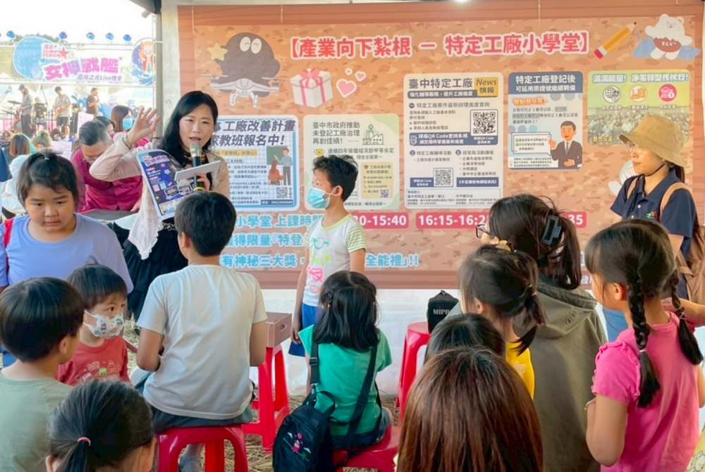 今年特別設置「特定工廠小學堂」,以趣味問答方式推廣臺中市未登記工廠輔導政策,協助民眾理解地方產業輔導與合法化推動成果,使政策宣導更易於被吸收與理解,也強化產業與地方文化間的連結。
