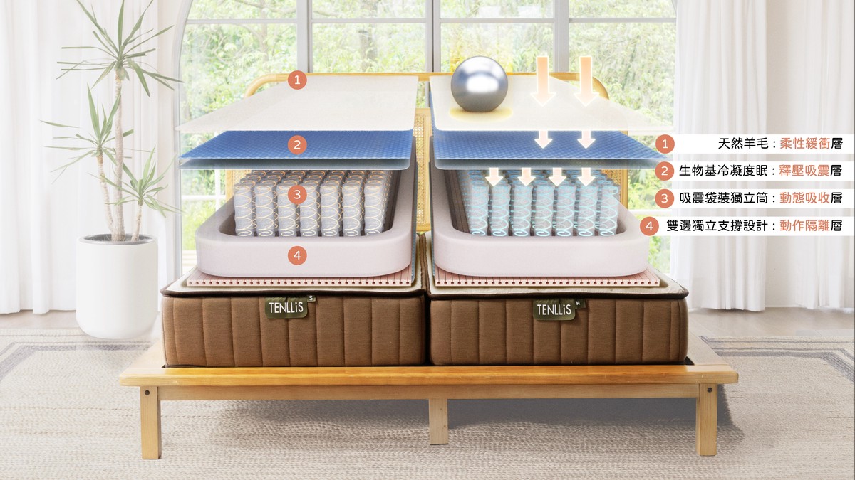 四層吸震結構 × 中鋼 CSS 獨立筒,吸收翻身震動、隔離動作影響,讓伴侶作息不同也能共享深度睡眠。圖片來源:Mr.BeD 倍得先生 提供