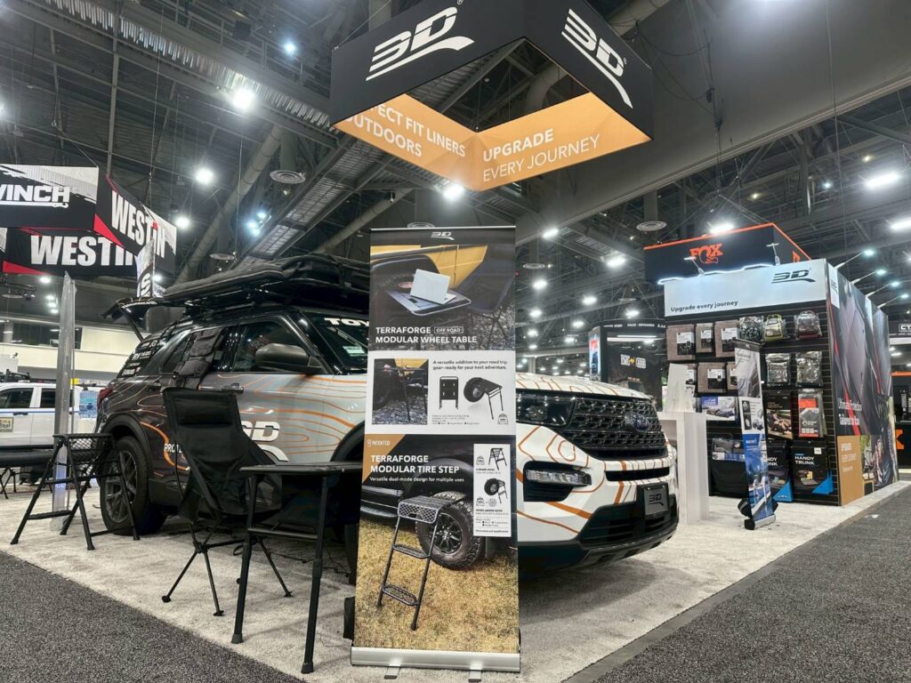 3D Mats(https://shop.3dmats.com/)深耕汽車內外飾件多年,以「車室生活升級」為產品研發核心,今年於SEMA展出的輪胎桌架與多功能輪胎梯架,不需任何工具即可安裝,兼具穩固與高承重量等優勢,適用於戶外野餐、機能工作檯、臨時維修,也能成為攝影裝備的支撐平台;比起傳統戶外裝備,3D Mats的設計更注重「行動性與節省車內空間」,為戶外玩家提供更多靈活的使用情境,預期將成為歐美市場Overlanding車宿族群與戶外愛好者的焦點新品。