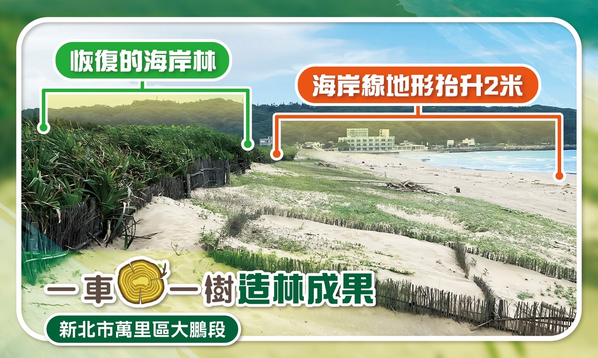 從本島到離島,「一車一樹」不僅為海岸注入新生命,也讓守護環境的信念持續擴散,成為串連人與土地幸福的重要力量。九年來,除了種樹之外,和泰汽車亦於植樹後持續執行長達三年的護樹行動,利用水寶盆技術使樹苗在沙地也能在淡水有限的情況下,一方面節約水資源,另一方面得到穩定供水,使苗木存活率提升至八成以上,成功翻轉沿海地區高溫乾旱、貧瘠土壤與鹽害風蝕等環境困境。經多年努力,部分地區已有效防止海岸線退縮並抬升地形,不僅形成穩定的防風林帶,更守護沿岸居民免受颱風、飛砂的侵襲。