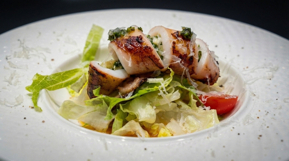 【小卷・燒烤紅甜椒醬・羅美・阿根廷青醬・切達起司】鐵板高溫鎖住小卷鮮甜,搭配燒烤紅甜椒醬與清爽的阿根廷青醬,香草的氣味既明亮又百搭,切達起司則讓口感更加圓潤。