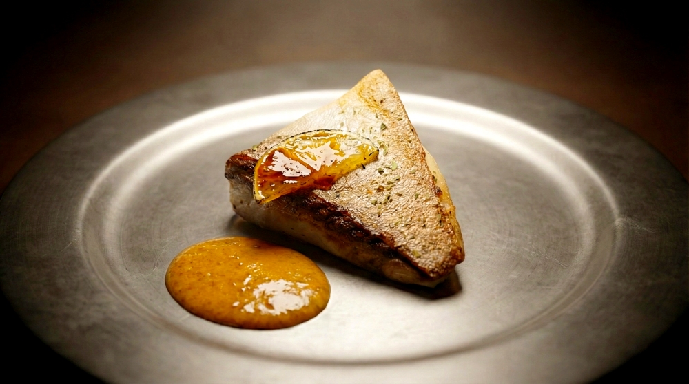 【金鯧魚・叻沙醬・川七・檸檬】金鯧魚以鐵板微煎至外皮酥香、內裡柔嫩,搭配以椰香與辛香料層層堆疊的叻沙醬,呈現濃郁而不膩的南洋靈魂,檸檬的明亮酸度則為料理注入熱帶的輕盈節奏。