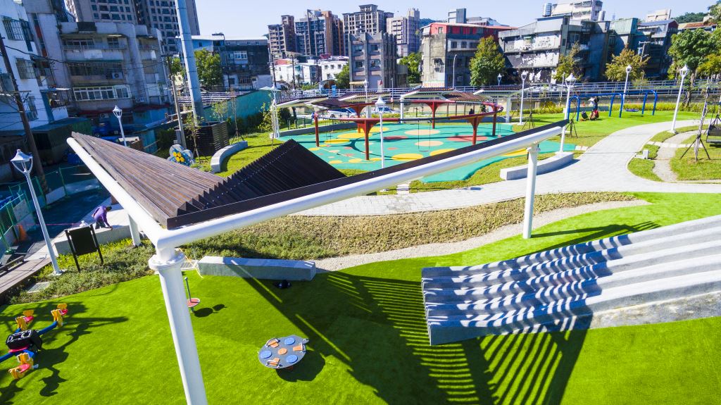 汐止區白雲公園則以紙飛機為主題的共融遊戲場為亮點,不僅遊具多元,也兼具挑戰性與趣味性。其中最引人注目的地標,是運用山坡地形打造的三層九道磨石子溜滑梯,包含直線及彎曲滑道,滿足不同速度與刺激度的需求;另外有全台首創的環狀六人鞦韆,讓孩子能面對面擺盪、增加互動樂趣。公園內配置廁所、洗腳區、體健設施及紙飛機造型遮陽棚,空間視野開闊、動線順暢,是兼具親子同樂與戶外休憩的友善公園。