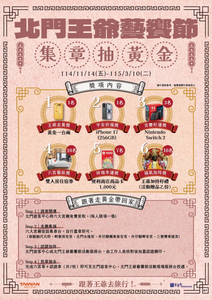 目前正火熱進行中的「北門王爺藝饗節集章遊」活動,特別祭出「實體黃金一台兩」作為頭獎,引發高度關注。雲管處徐振能處長表示,黃金象徵著至高的祝福與吉祥,與王爺信仰中守護、庇佑的文化意涵相得益彰,希望讓民眾在親近文化的過程中,不僅收穫深刻的節慶記憶,更能帶回滿滿的正能量。除了備受矚目的黃金大獎,豐富的獎項還包括 iPhone 17 (256GB)、Nintendo Switch 2、雙人房住宿券、7-ELEVEN 千元商品卡及多項王爺加持的專屬好禮,讓遊客在誠心祈福之餘,也能與好運驚喜不期而遇。